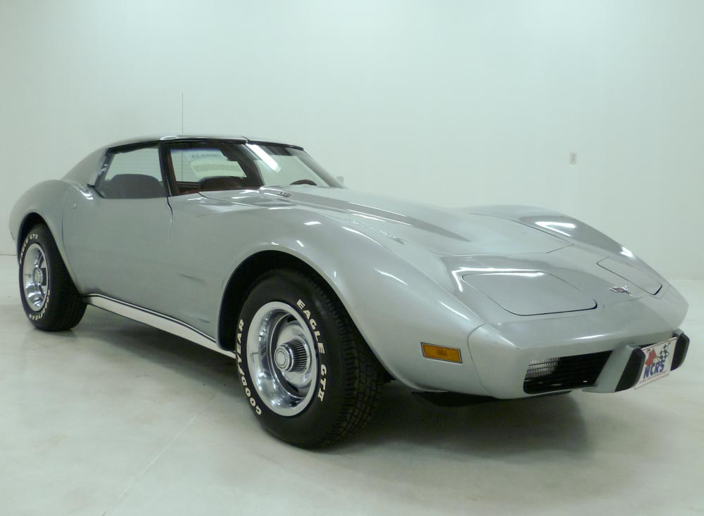 1006W..1977 Corvette Time Capsule Coupe with removable T-Tops, L82, 4 speed, 10,021 actual mile time-capsule in pristine new original condition. Factory Silver paint with Red leather interior. Multiple NCRS Top Flight awards including a Regional Top Flight. Options include factory air conditioning, Gymkhana suspension, M21 close-ratio 4-speed transmission, leather, tilt-n-telescopic steering column, rear window defogger, power steering, power brakes, power windows, AM/FM stereo radio, luggage rack and roof panel carrier, floor mats, rally wheels and raised white lettered tires. Most all factory correct components. Documented with the GM build sheet, owner's manual envelope with warranty pamphlets/maintenance schedule brochures, sales brochure, and NCRS awards. Looks, runs and drives like a new 1977 49 year old car. $49,000.00