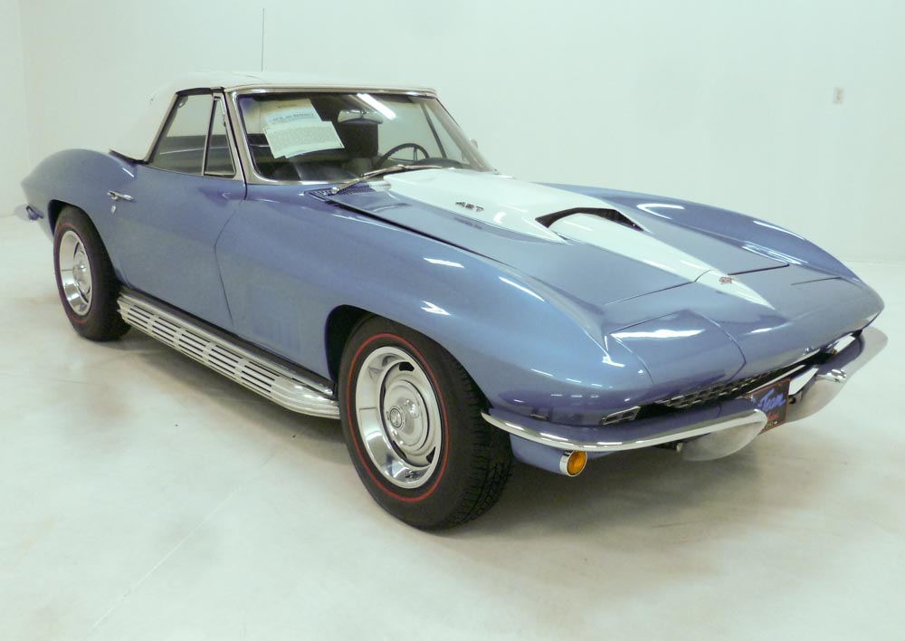 1013U..1967 Corvette Convertible, 427-435 hp, 4 speed, numbers matching transmission and rear end but motor is a later replacement #3916321 with an August 7, 1967 date and stamped T0815IL (August 15th), has factory original body/trim tag with CCAS/Grenning affirmation. Marina Blue paint with White stinger, White/Bright Blue combo interior and White soft top. Rare color combination considering only 673 were produced with White/Bright Blue color combination interiors in 1967 in both coupes and convertibles. Body-on restored years ago and winner of many shows with Trophies and awards included with our sale. Optioned with factory side exhaust (born with), power steering, power brakes, tilt-n-telescopic steering column, tri-power, M-21, 3.36 posi, AM/FM radio, tinted glass, rally wheels, and Coker classic red stripe radials. Most all factory correct type components including the spare, jack, jack tools, seat belts, washer system, shifter, shielding, braided wires, radiator, gas door assembly, glove box door, owners manual, and sales brochure. Documented with the tank sticker (build sheet) that has been validated by NCRS using GM records, CCAS/Grenning trim tag affirmation, many show awards/trophies , color copy of the 1979 title and 3-ring binder. Just in from the past owner of 46 years who purchased in 1979. Production date of May 4th, 1967 and delivered new by Konner's Chevrolet in Columbus, OH (dealer code 361 in zone 9) per the official NCRS/GM Shipping Data Records (SDR). Looks, runs, and drives excellent. CC:2 $99,000.00