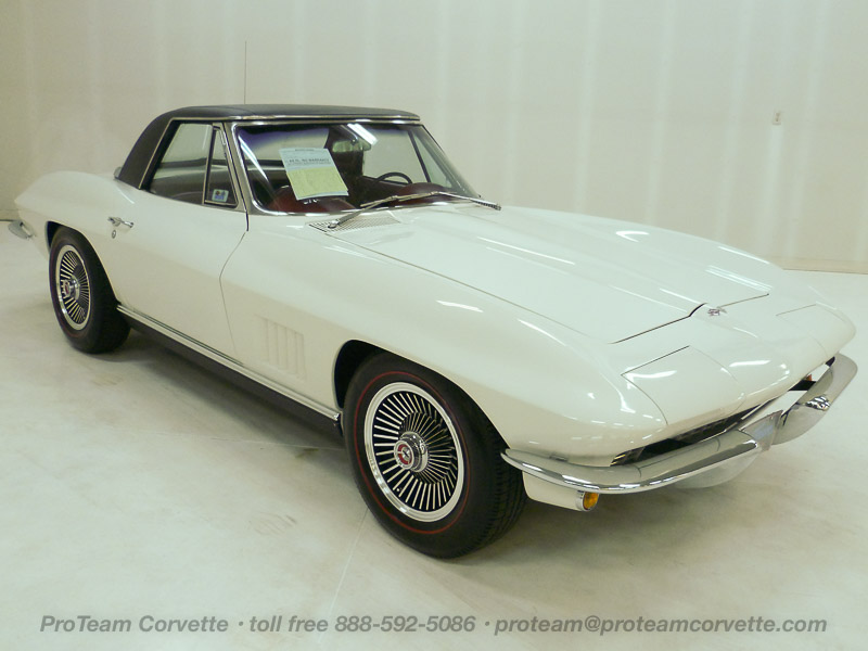 1018U..1967 Corvette Convertible with Two Tops, 427-435 hp, 4 speed, numbers matching original motor, transmission and rear end, also has factory original body/trim tag. Ermine White paint with Bright Blue stinger, Bright Blue interior, and Blue soft top. Rare documented color combination that has been body-off restored and subsequently shown earning the Bloomington Gold certification and multiple NCRS Top Flight awards. NO HIT GM front end with grill tab in place. Paint has aged gracefully but has some checking. The standard bore motor was also rebuilt during restoration. Also has an affirmation by CCAS/Grenning as to the legitimacy and originality of the engine block, stamp pad, and the engine stamp. Optioned with factory side exhaust (born with), headrest seats, transistorized ignition, black vinyl auxiliary hardtop, M-21, 4.11 posi, SS brakes, AM/FM radio, tinted windshield, Kelsey B.O. aluminum wheels and your choice of 7.75x15" vintage red stripe tires or modern white stripe radials. Most all factory correct type components including the spare, jack, jack tools, clear floor mats, seat belts, washer system, shifter, shielding, braided wires, air cleaner, alternator, distributor, hoses, hose clamps, carbs, starter, valve covers, radiator, five Kelsey B.O. aluminum wheels, gas door assembly, glove box door, owners manual, sales brochure, and T-3 headlights. Documented with the NCRS/GM validated tank sticker, CCAS/Grenning Engine Stamp Affirmation, warranty book/P.O.P., restoration photos/receipts, Bloomington and NCRS judging sheets, NCRS Confirmation of Judging Awards, owners manual packet and multiple 3-ring binders. Also has extensive owner history including John Danos, George Page and Michael Seskin. Just in from the past owner of 25-years. Production date of May 15th, 1967 and delivered new by Rosenthal Chevrolet in Arlington, VA (dealer code 475 in Zone 14) per the official NCRS/GM Shipping Data Records (SDR). Looks, runs, and drives excellent. CC:+2 Consigned to Mecum Kissimmee Collector Car Auction January 15th - 17th, 2026