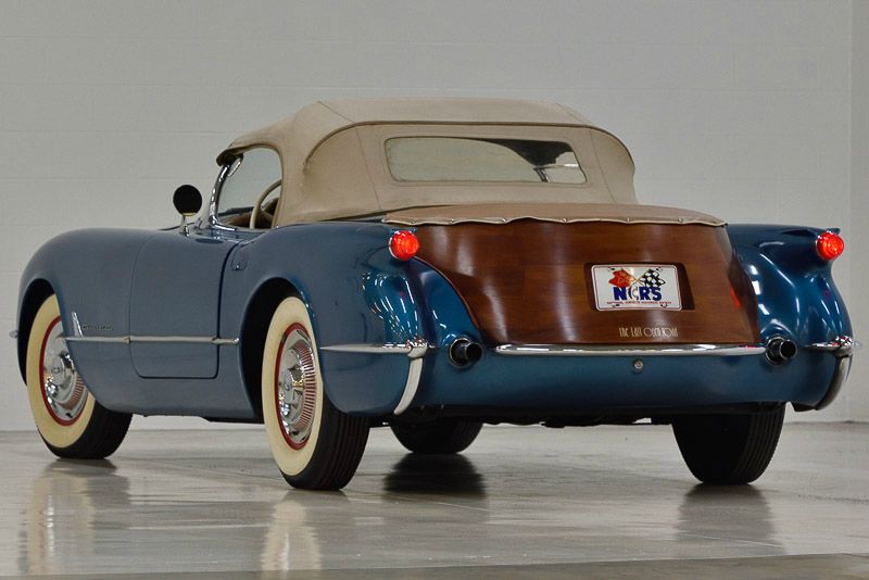 1017R..1954 Corvette Roadster Pick-Up with mahogany bed designed and built by George Prentice (GM Design and Styling staff employee). A predecessor to the Corvette inspired SSR. This transformer can change from a stock original Corvette to a roadster pick-up in less than 2-hours or vice versa, Blue Flame Six, powerglide, numbers matching motor, transmission and rear end. Pennant Blue paint with Beige interior and Beige soft top. Very rare two-year color with only 300 produced. Highly original with exception of one repaint in 1975 with recent comprehensive detail and rebuild of motor, rear end, carbs and radio in 2019-2023. Multiple NCRS Flight awards including National and as recent as 2020. Also participated in many Detroit area concours and invitiationals with autographed photo of Zora Arkus-Duntov sitting in this car. Displayed at the Detroit Historical Museum in the General Motors 75th Anniversary exhibit in 1983-84 and referred to as a "high quality presentation". Two-owner car purchased by William Mullaly a GM manager at General Motors Design and Styling Center and subsequently sold in 1970 to George Prentice who was another Design Associate/employee and owned, cherished and maintained this car until recently (2023) for 53 years. Optioned with powerglide, 3.55 rear, Wonderbar radio, e-brake warning light, windshield washers, courtesy lights, heater, hubcaps, and 6.70x15" wide white tires. Also has tonneau cover and trunk full of spare parts. Most all factory correct type components including the spare, jack, jack tools, trunk mat, trunk liner, side windows, side window bag, rebound straps, washer system, shifter, shielding, air cleaners, hoses, hose clamps, hood alignment blocks, valve cover, hood pop-ups, side draft carbs, #241 head, expansion tank, radiator, guide Y-50 mirror, and owners manual. Documented with the 1955 dealer invoice, conditional sale contract, second owner purchase invoice/receipt in 1970, extensive receipts from the 1970's through 2023, historic photos, news articles and features, NCRS certificates and judging sheets all neatly organized in four large 3-ring binders. Also has shop manual, owners manual, Chevrolet service news bulletins, NCRS Specification Guide, NCRS judging manuals and a Noland Adams autographed Restoration and Technical Guide... Simply amazing!!! Looks, runs, and drives excellent considering that this car is almost 70 years old! CC:+2 $110,000.00