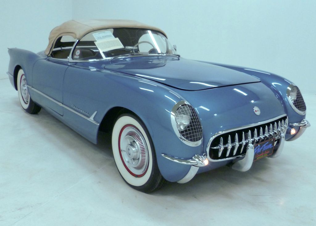 1020R..1954 Corvette Convertible, Blue Flame Six, powerglide, numbers matching and correct including the #241 head, Pennant Blue paint with Shoreline Beige interior and matching Beige soft top. One of only 300 produced in this rare color. 934 miles since body-off restoration. It is believed that this Corvette was previously owned by the hit series Hee-Haw legend, Roy Clark. Optioned with powerglide, 3.55 rear, Wonderbar radio, e-brake warning light, windshield washers, courtesy lights, heater, hubcaps, and vintage 6.70x15" Firestone wide white tires. Most all factory correct type components including the spare, trunk mat, trunk liner, side windows, side window bag, rebound straps, spiral shocks, washer system, shifter, shielding, air cleaners, generator, distributor, hoses, hose clamps, hood alignment blocks, blue flame valve cover, hood pop-ups, side draft carbs, #241 head, expansion tank, radiator, guide Y-50 mirror, owners manual, and sales brochure. Documented with a framed copy of "Rockin' in the Country" album featuring Roy Clark and a 1954 Pennant Blue Corvette, Texas black license plate dated 1954, owner history back to 1993, receipts, and 3-ring binder. Production date of July 14th per the NCRS Birthday Book (This was two days prior to the end of 1954 production). Looks, runs, and drives very nice for a 71-year old dinosaur. CC:2 $88,000.00