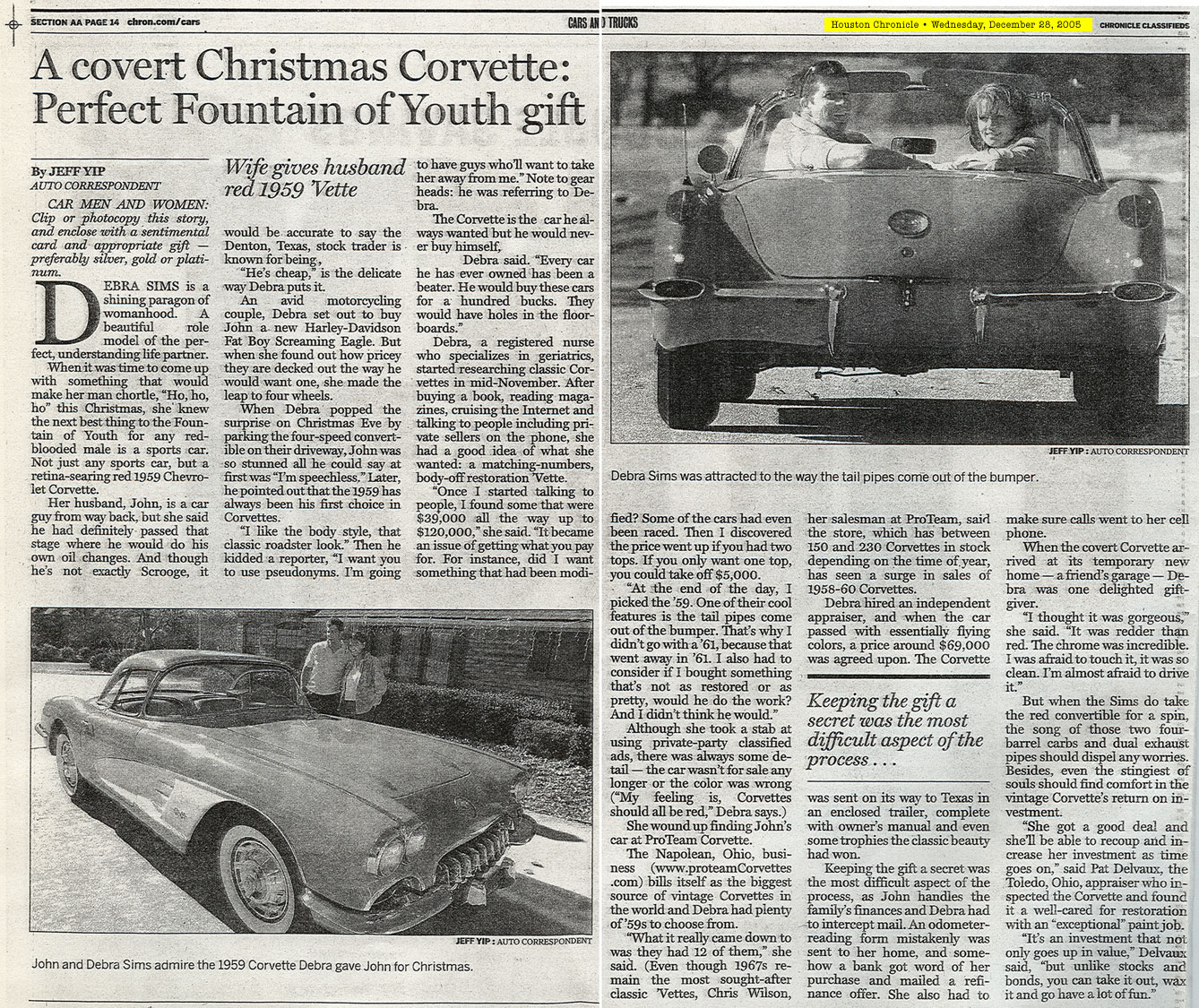 This '59 Red Corvette left ProTeam late December '05 arriving in Texas in time for one heck of a Christmas surprise. Debra was drawn to a ProTeam Corvette because of the selection of '59 Vettes. The gift was reported by Jeff Yip of the Houston Chronicle. Read Debra and John's entire story by clicking here. John is one lucky guy and Debra is one savvy shopper... Boy, I hope she gets my name in next year's gift exchange.