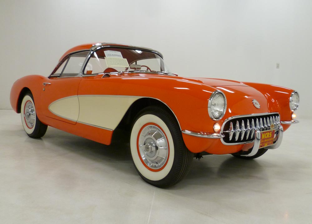 1004W..1957 Corvette Duntov Convertible Hardtop, 283-270 hp, (2x4s), 3-speed, numbers matching. Venetian Red paint with Beige coves and Red interior. Body-off restored by NCRS judge (Ed Hoffman) resulting in a plethora of awards that include two Bloomington Gold awards, four NCRS Top Flight awards, the NCRS (PV) Performance Verification award, the coveted NCRS Duntov Mark of Excellence award, and the AACA National First Prize Award. The most recent awards include: Bloomington Gold (2025), Class Award at the Amelia Concours d'Elegance (2025) and the Bill Rudd Memorial Corvette award at the Cincinnati Concours d'Elegance (2025). This restoration included blue printing the motor with a Duntov cam and #997 heads. The expenses involved in obtaining these awards would surely exceed $20,000.00. These type restorations normally cost between $125,000.00 to $150,000.00. Radio, heater, and soft top delete car optioned with auxiliary hardtop, posi, dual fours, off road exhaust, hubcaps, and vintage 6.70x15" wide white tires. Also has custom fit car cover. Most all factory correct type components including the spare, jack, jack tools, trunk mat, trunk liner, rebound straps, spiral shocks, shifter, air cleaners, generator, starter, distributor, hoses, hose clamps, hood alignment blocks, nine fin valve covers, hood pop-ups, fuel filter, carbs, guide Y-50 mirror, owners manual, sales brochure, and T-3 headlights. Documented with the original owners manual, California black license plates, restoration photos, NCRS Confirmation of Awards, show awards, certificates, and judging sheets all neatly organized in no less than 4 binders. Please note that the NCRS Duntov plaque was kept by a previous owner. Sold new at Lellis-Brooks Chevrolet in San Francisco, CA and called the Golden State its home until 2008. Production date of May 2nd, 1957. Looks, runs, and drives excellent. CC:1 Consigned to Mecum Indy Classic Car Auction | May 15th – 16th, 2026 | Mecum Lot S174