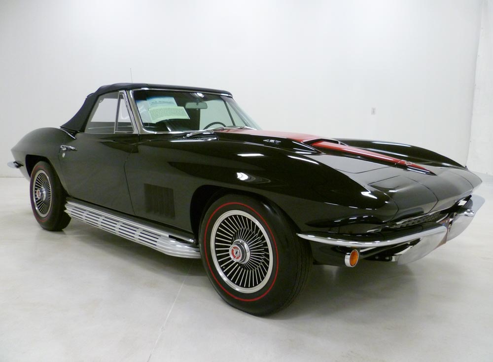 1008W..1967 Corvette Convertible, 427-390 hp, 4 speed, numbers matching original motor with CCAS/Grenning Affirmation and also has factory original body/trim tag. Tuxedo Black paint with Red stinger, Black interior and Black soft top. Comprehensive restoration that appears body-off in show condition for Bloomington Gold and NCRS type judging. Optioned with factory side exhaust, leather, M-21, posi, SS brakes, AM/FM radio, B.O. aluminum wheels and vintage Firestone 7.75x15" red stripe tires. Most all factory correct type components including the spare, jack handle, clear floor mats, shocks, seat belts, washer system, tar top battery, shifter, shielding, braided wires, air cleaner, alternator, #3811 carb, hoses, hose clamps, radiator, gas door assembly, Bowtie mirror, glove box door, owners manual and sales brochure. Documented with the CCAS/Grenning Engine Stamp Affirmation, owner history, two show boards and the NCRS Shipping Data Report with production date of September 6th, 1966 and delivered new by Van Chevrolet in Shawnee Mission, KS (dealer code 885 in zone 5) per the official NCRS/GM Shipping Data Records (SDR). This recently restored Corvette has yet to be shown, creating an exciting opportunity for the next owner to exhibit the car and compete for trophies, awards, and recognition! Looks, runs, and drives excellent. CC+2 Consigned to Mecum Indy Classic Car Auction | May 15th – 16th, 2026 | Mecum Lot S229