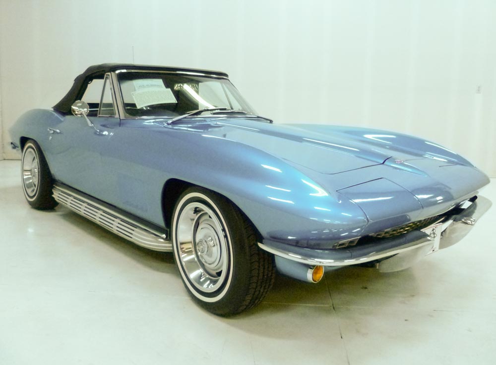 1027U..1967 Corvette Convertible, two tops, 327-300 hp, factory air, powerglide, numbers matching original motor, transmission and rear end with CCAS/Grenning Engine Stamp Affirmation, also has factory original body/trim tag, 73,121 actual miles.